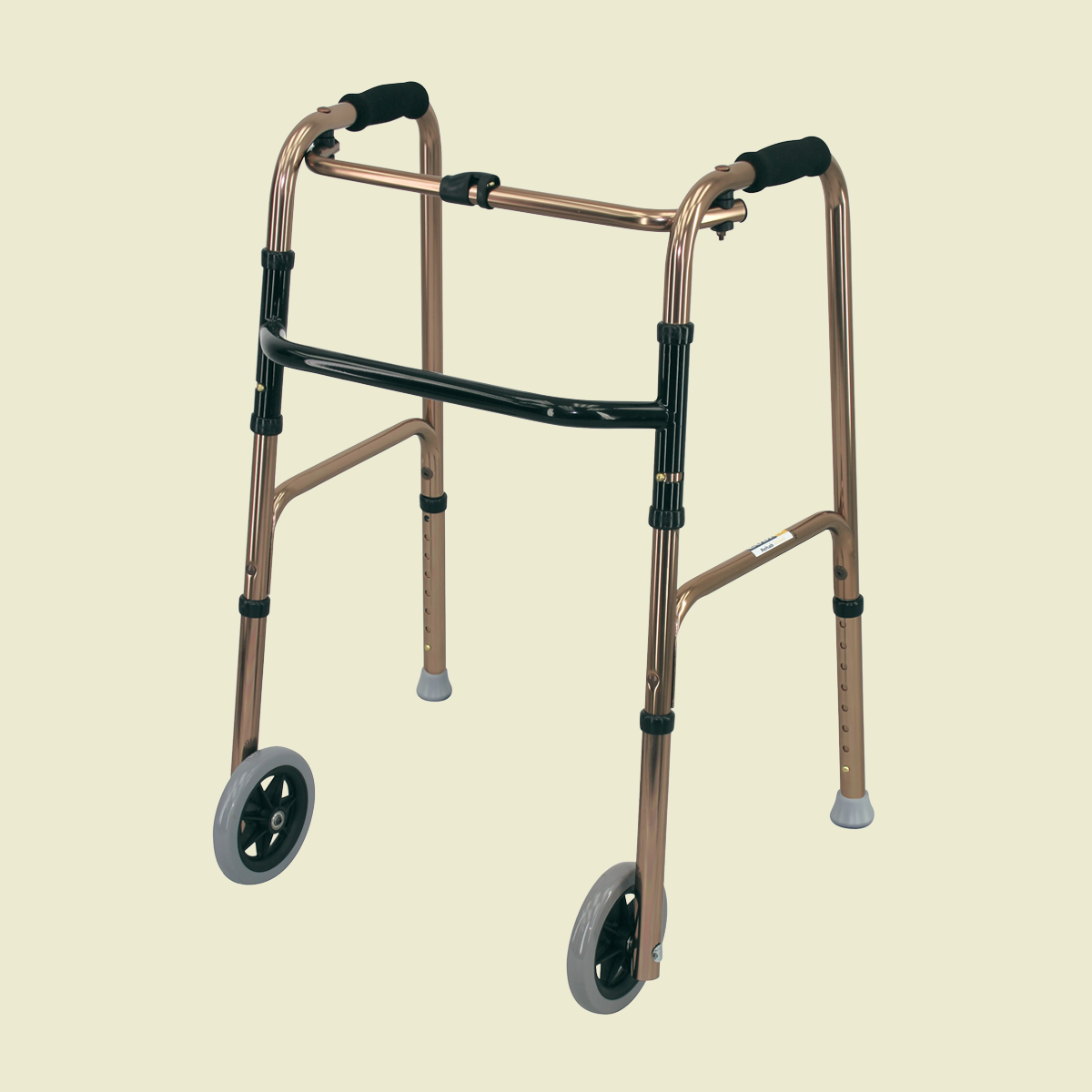 These lightweight aluminium frames are height-adjustable and fold away for easy storage. The unique hoop design gives maximum strength, stability and long-life. They are elegant looking in bronze aluminium. Front castor wheels with Rear Stops.
