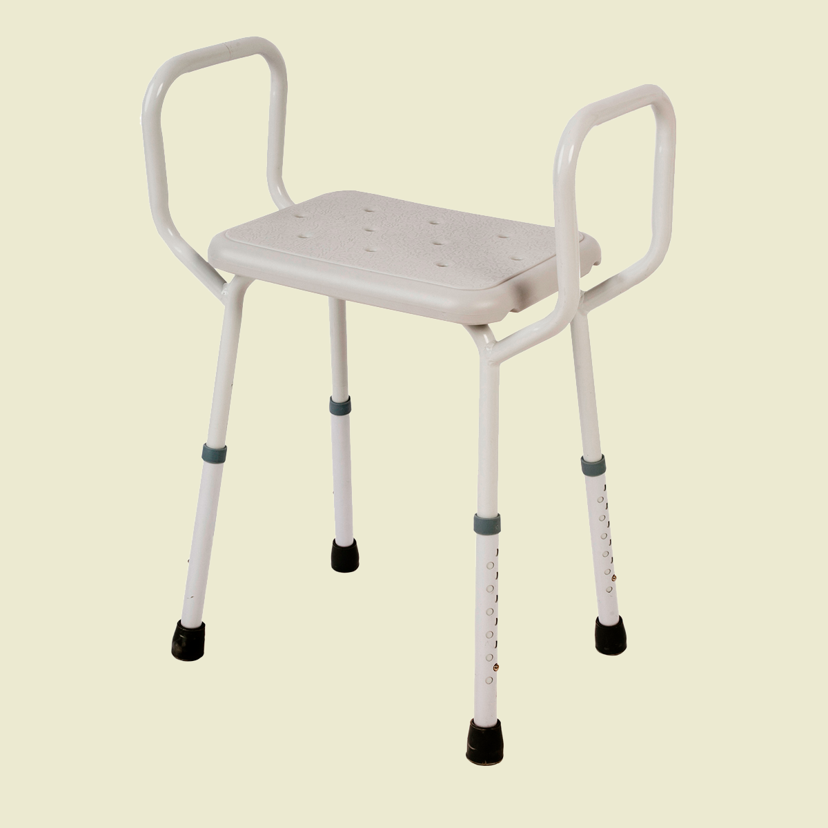 The Shower Stool with Arms is compact enough for virtually any shower space. Made from lightweight aluminium, it features a durable, non-slip plastic seat. Its height-adjustable design includes double holes on two legs and non-slip rubber tips for stability on uneven surfaces.